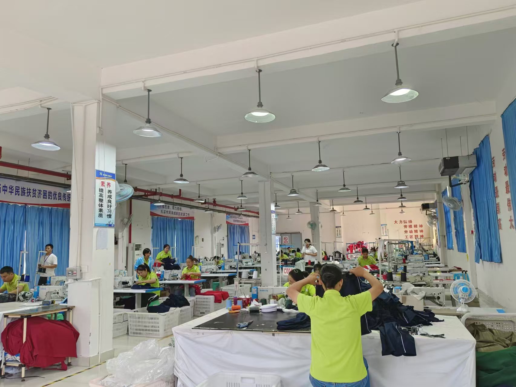 随后,调研团参观了贵州彩阳服饰有限公司生产车间。公司为当地中小员工产款式新颖的三季校服,也为香港客户生产医务和保洁等岗位的制服。脱贫攻坚时期,公司在生产车间提供扶贫岗位,积极承担社会责任。目前,部分脱贫户通过技能培训成功前往外省务工,需要照顾家人的脱贫户则可以继续留在车间工作。车间工人的人均工资可达约3000元/月,熟练工人收入可达6000元/月,工人们工作热情高涨,很多人愿意通过加班来增加收入。