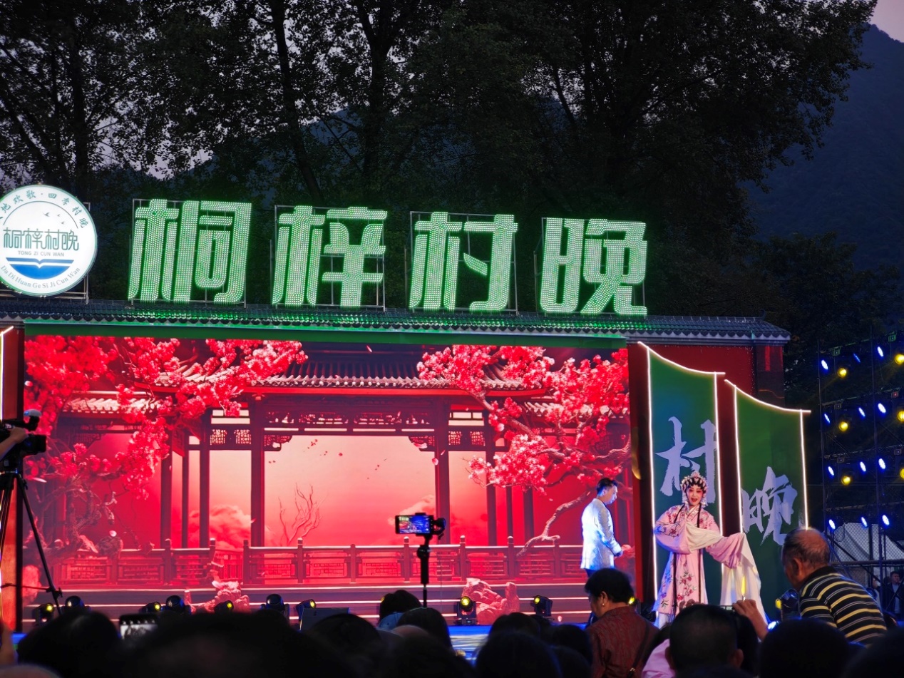 8月16日晚上,调研团来到桐梓县九坝镇山堡村调研当地“村晚”。山堡村位于九坝镇西北部,距县城25公里,夏季气温凉爽,且与重庆距离较近。通过政府积极搭台、群众广泛参与,起初村民和游客自发推动的“消夏晚会”逐渐发展成为如今定期举办的“桐梓村晚”。本次晚会有对口帮扶的珠海团队参与,节目主打贴近生活、生动有趣,全场座无虚席,场外也挤满了围观的人群,由当地各部门轮流组织的“气氛组”与场内观看的游客热情互动。2024年6月底到8月中旬,“桐梓村晚”拉动全县街区消费3000多万元,全镇乡村旅馆的总收入达3.5亿元,实现了当地旅游经济与游客精神生活的双赢。