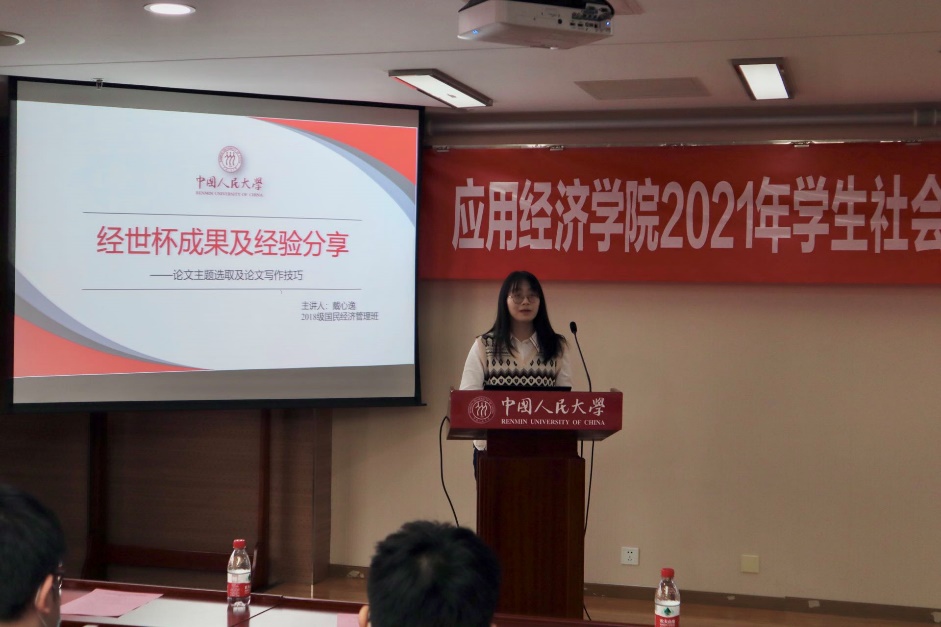 2018级国民经济管理本科生戴心逸是第二届“经世杯”论文竞赛特等奖获得者,同时获得了公司“创新杯”员工课外学术科技作品竞赛特等奖。她结合自己参加“经世杯”比赛的经历,围绕如何确定选题、如何搜集文献和数据以及论文写作规范三个方面介绍经验,并为大家分享了文献和数据来源。