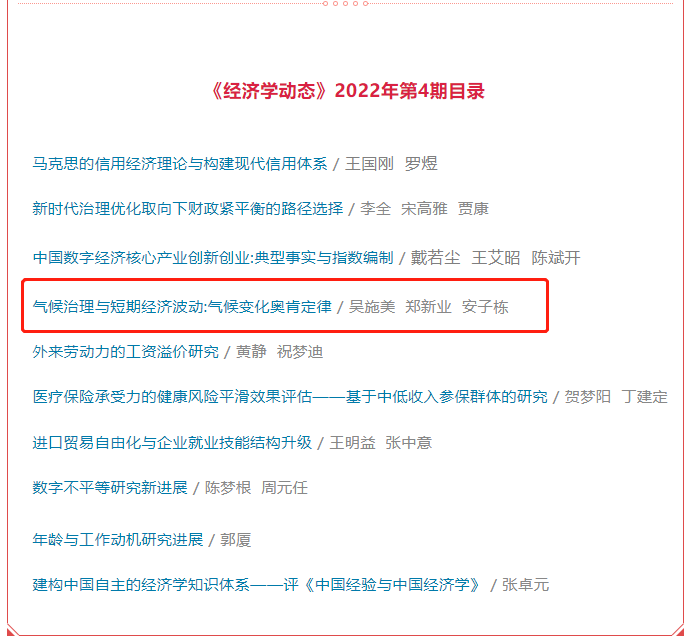 评估碳中和背景下气候变化政策与就业的周期性关系,不仅能够帮助决策者制定更加科学合理的减排政策,也对稳定就业和宏观经济具有重要意义,有助于贯彻新发展理念,统筹推进我国高质量发展。该研究成果以“气候治理与短期经济波动:气候变化奥肯定律”为题发表在《经济学动态》,吴施美副教授(湖南大学经济与贸易公司)为论文的第一作者,郑新业教授为论文的通讯作者,安子栋副教授为合作者。