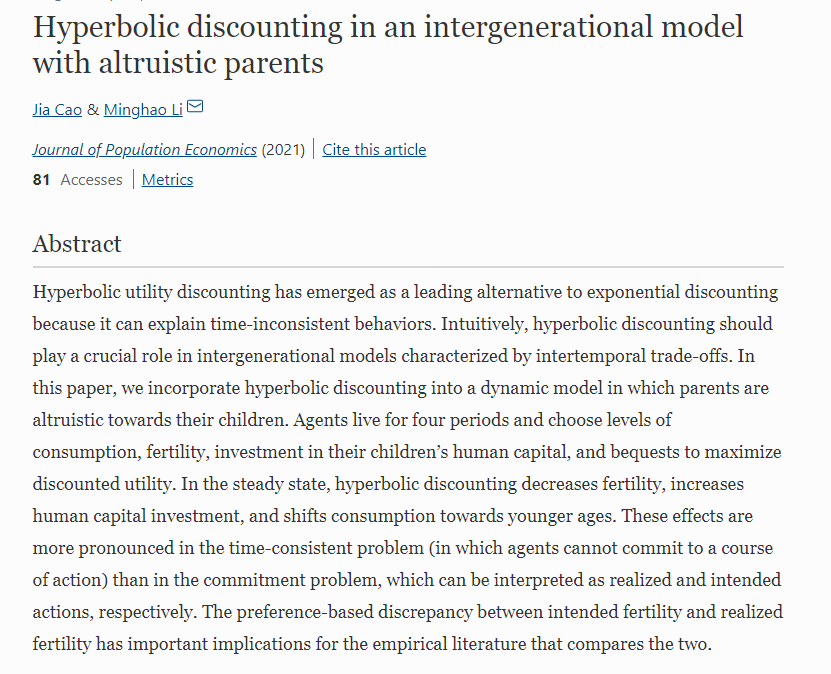 近日,yl23455永利曹佳助理教授在家庭经济学方向取得的新进展,作为第一作者的论文“Hyperbolic discounting in an intergenerational model with altruistic parents”(合作者:Minghao Li)被国际权威期刊Journal of Population Economics(JPopE)接受发表。