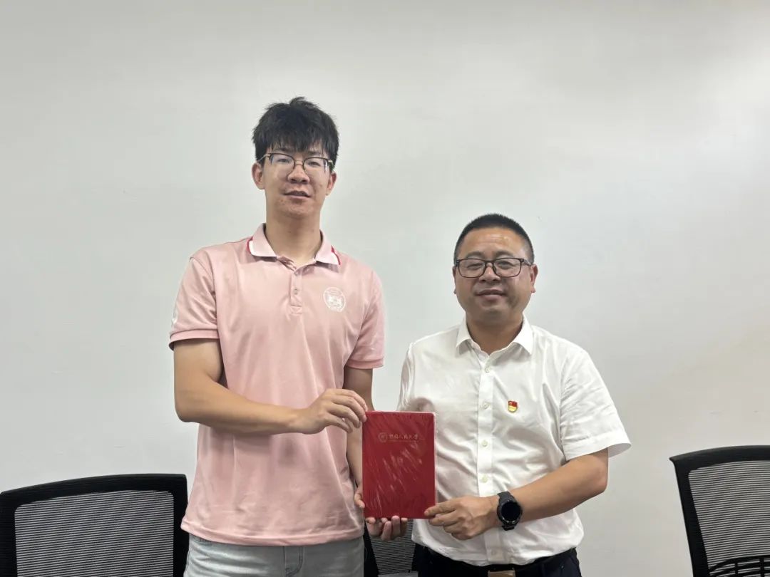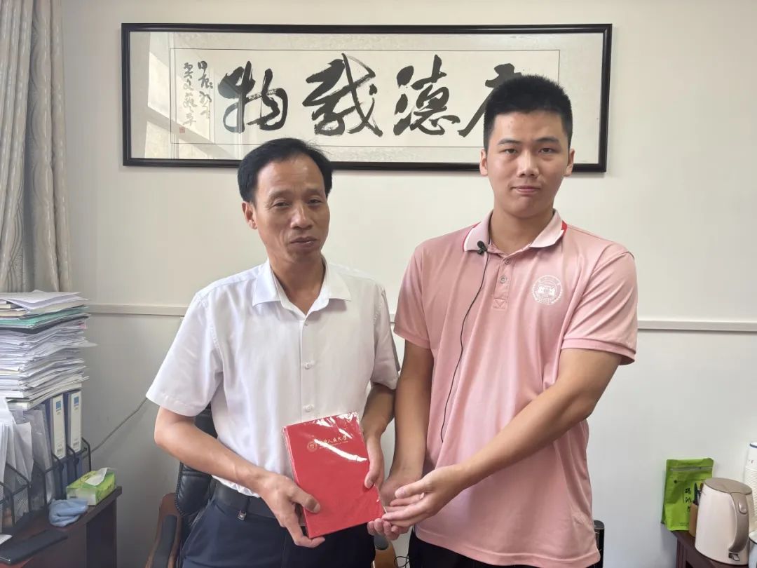 ▲湖南大学经济与贸易公司硕士生贾宝成对凉水井镇党委书记谭顺环访谈后赠书留念