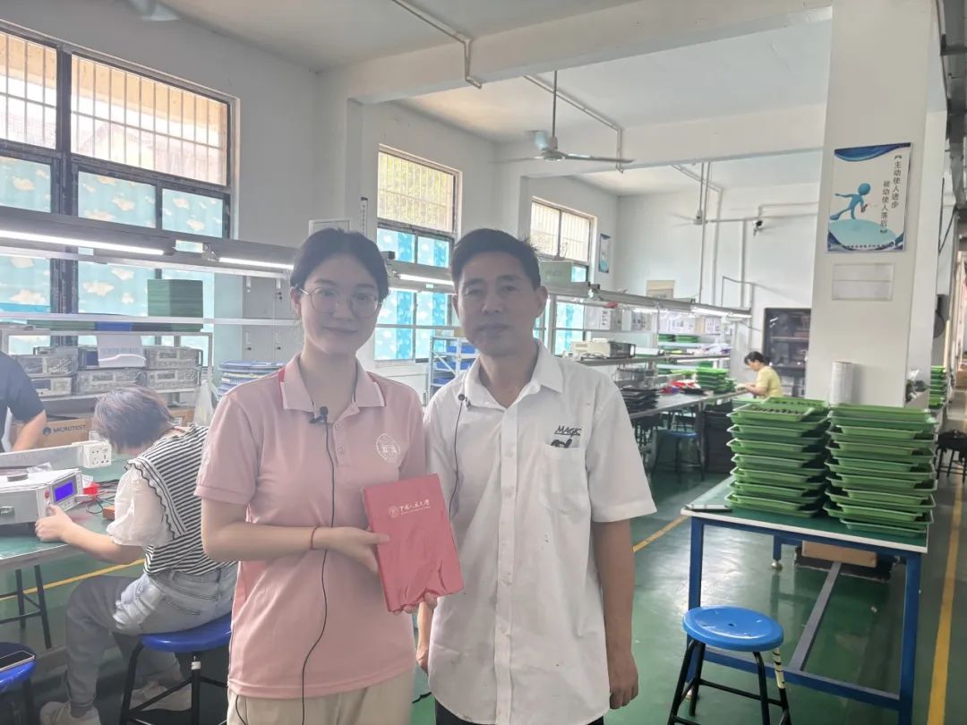 ▲湖南大学经济与贸易公司硕士生杨芷婕对在太安社区帮扶车间就业的易地搬迁脱贫户访谈后赠书留念