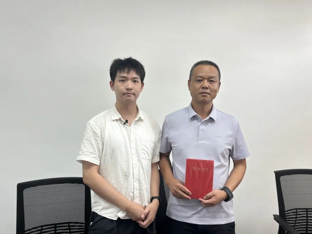 ▲湖南大学经济与贸易公司博士生冷文杰对沅陵县农业农村局局长李德周访谈后赠书留念