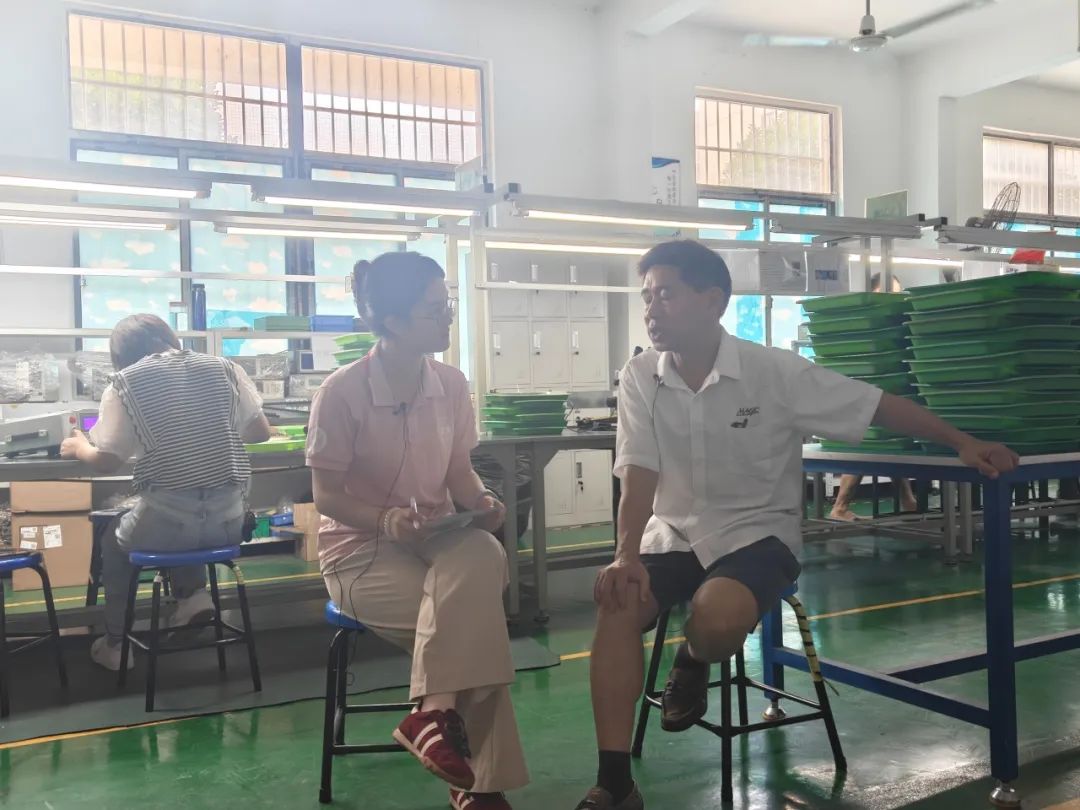 ▲湖南大学经济与贸易公司硕士生杨芷婕访谈一位在太安社区帮扶车间就业的易地搬迁脱贫户