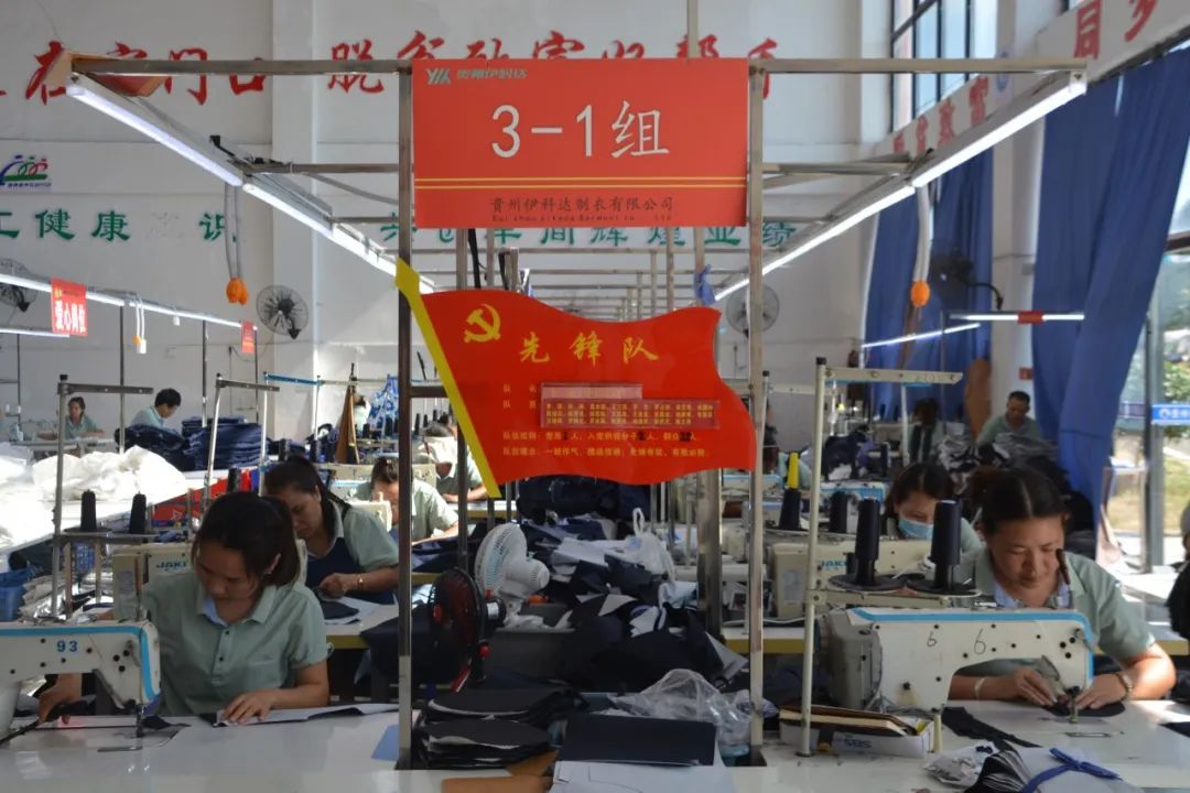 “车间建在家门口,脱贫致富好帮手。”当地积极招商引资,创办扶贫车间,为搬迁群众提供家门口的就业岗位。调研团来到贵州伊科达制衣有限公司的扶贫车间,该企业创建于2003年,以生产职业工装为主,2019年迁至此地后,累计解决搬迁群众就业200余人,还为60名残疾人士提供就业岗位,被评为省级先进就业扶贫车间。企业也在扶贫中发展获益,通过当地政府牵线,该扶贫车间得以获取贵州茅台等许多大型国有企事业单位的订单,年产值已近7000万元。