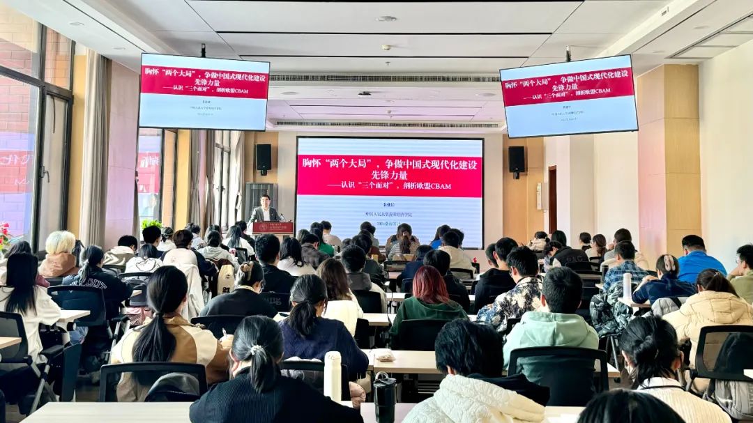裴建锁系统梳理了党的十八大以来全面深化改革的历史脉络,介绍了《中共中央关于进一步全面深化改革 推进中国式现代化的决定》的基本内容。他从历史事实出发,介绍了我国在经济发展、创新能力、生态文明建设等方面的长足进步,以欧盟碳边境调节机制(CBAM)为例分析了其产生的影响,并从产业高端化、产业智能化、产业绿色化、立足产业链供应链优势、推行全球竞争新战略等方面为大家讲解了因地制宜发展新质生产力的改革举措等。裴建锁指出,作为新时代的青年,要胸怀中华民族伟大复兴的战略全局和世界百年未有之大变局“两个大局”,将个人理想融入国家和民族的事业中,争做中国式现代化建设的先锋力量。