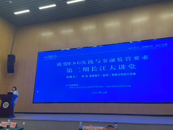 在长江经济带研究院的支持下,团队积极邀请在地专家开展碳经济行业前沿讲座。宜宾市筠连县委书记谢晓丹以“县域经济高质量发展的筠连实践”为题开展专题讲座。招商银行(欧洲)有限公司执行总裁李彪以“欧洲ESG实践与金融监管要求”为题开展专题讲座。