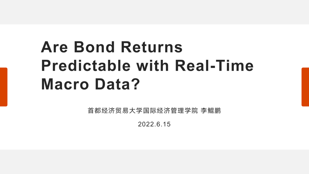 主讲嘉宾为首都经济贸易大学国际经济管理公司经理、教授李鲲鹏。李鲲鹏以“Are Bond Returns Predictable with Real-Time Macro Data?”为题进行了分享。他提出了一种新的预测方法,用以在明确考虑预测目标与潜在因素之间的非线性关系以及弱因素存在的情况下,考察实时宏观变量是否可以预测债券收益。他发现,将该方法应用于政府债券收益,具有显著的样本内和样本外预测能力,产生了可观的经济价值。随后,他详细介绍了所担任主编的期刊接收文章的主要方向和要求。