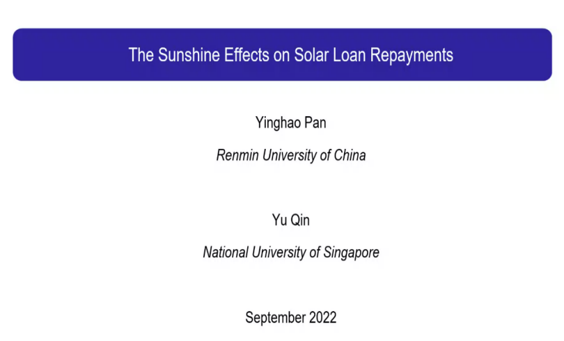 主讲嘉宾为新加坡国立大学长聘副教授、北大国发院访问副教授秦雨 。秦雨以“The Sunshine Effects on Solar Loan Repayments”为题进行了分享。她首先介绍了民用太阳能市场的火热及太阳能贷在全球富有争议的发展历程,提出了追踪分析中国太阳能贷的重要意义。接着从短期和长期两个方面介绍了天气、尤其是阳光是否充裕对于借款人还款动机的影响。此外,她分析了太阳光照对于太阳能贷偿还意愿背后的作用机制,发现投射偏误等心理认知是导致贷款违约的主要原因”。由此,她针对如何避免借款人违约风险提出了一系列政策建议。最后,她就所在期刊,从审稿人角度给出了一些相关研究开展和论文写作方面的建议。