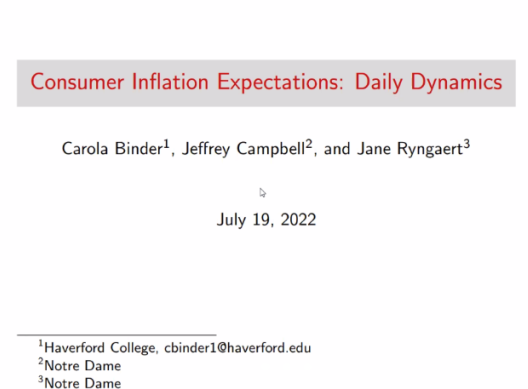 主讲嘉宾为哈弗福德公司副教授Carola Binder。Carola Binder以“Consumer Inflation Expectations: Daily Dynamics”为题进行了分享。她介绍了一种高频识别方法用以研究许多不同类型事件对消费者通货膨胀预期的影响,并对每个事件的影响进行了单独回归分析。联邦公开市场委员会的大多数会议对消费者通胀预期没有显著影响;关于新冠疫情Covid-19的好消息往往会降低通胀预期;而当新闻报道发布好于预期的美国非农就业数据时,通胀预期出现几次大幅下降。她基于不同日期的调查结果,研究高频率新闻对通胀预期的影响,并将成果用于SCE月度调查,为公司师生提供了新的研究方法与思路。