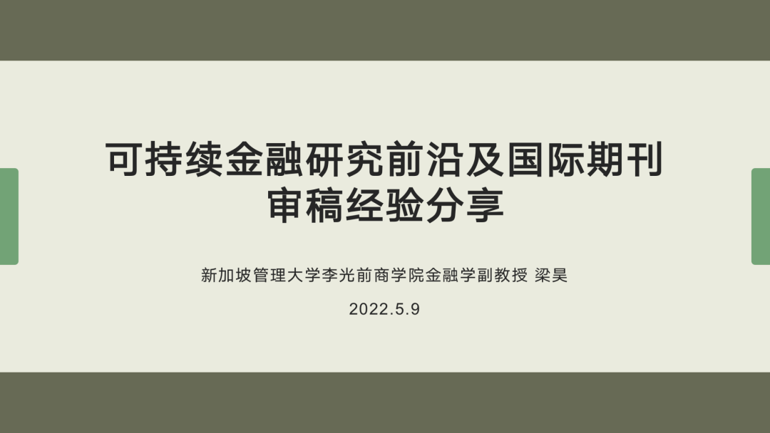 主讲嘉宾为新加坡管理大学副教授梁昊。梁昊以“可持续金融研究前沿及国际期刊审稿经验”为题进行了分享。他围绕可持续金融相关研究问题的现状和学术前沿、个人科研经历以及国际顶级期刊论文发表经验展开,梳理了可持续金融的热门概念及其联系,从金融学角度结合相关文献介绍了对ESG的认识,讲解了学术研究中ESG度量的数据处理、比较和挑战,提出了在研究发现中的重要问题,并结合相关文献做出总结。随后,他介绍了国际经管期刊的审稿流程,以及期刊对金融学、会计学、管理学学术论文发表的要求,并提出相关建议,最后对公司师生提出的问题进行了详细解答。
