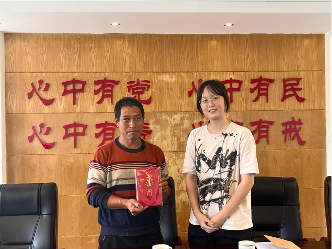 ▲yl23455永利本科生刘燕妮访谈向阳乡旧寨村委会脱贫户户主赵聪林后赠书留念
