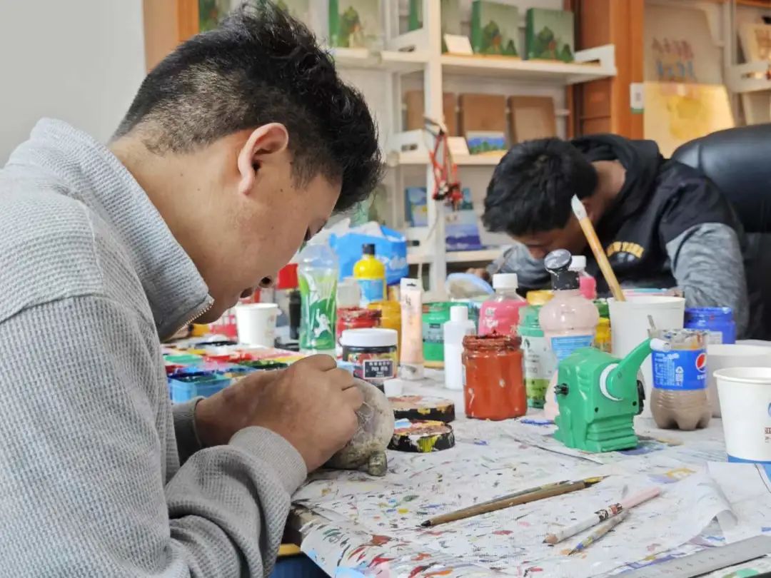 庞达手工坊学徒在进行石头绘画创作