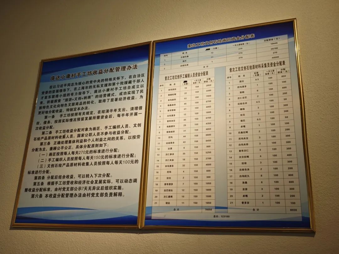 庞达手工坊悬挂的“人靠谱,事办妥”字样刺绣画,表达了对上海市普陀区对口帮扶的感谢