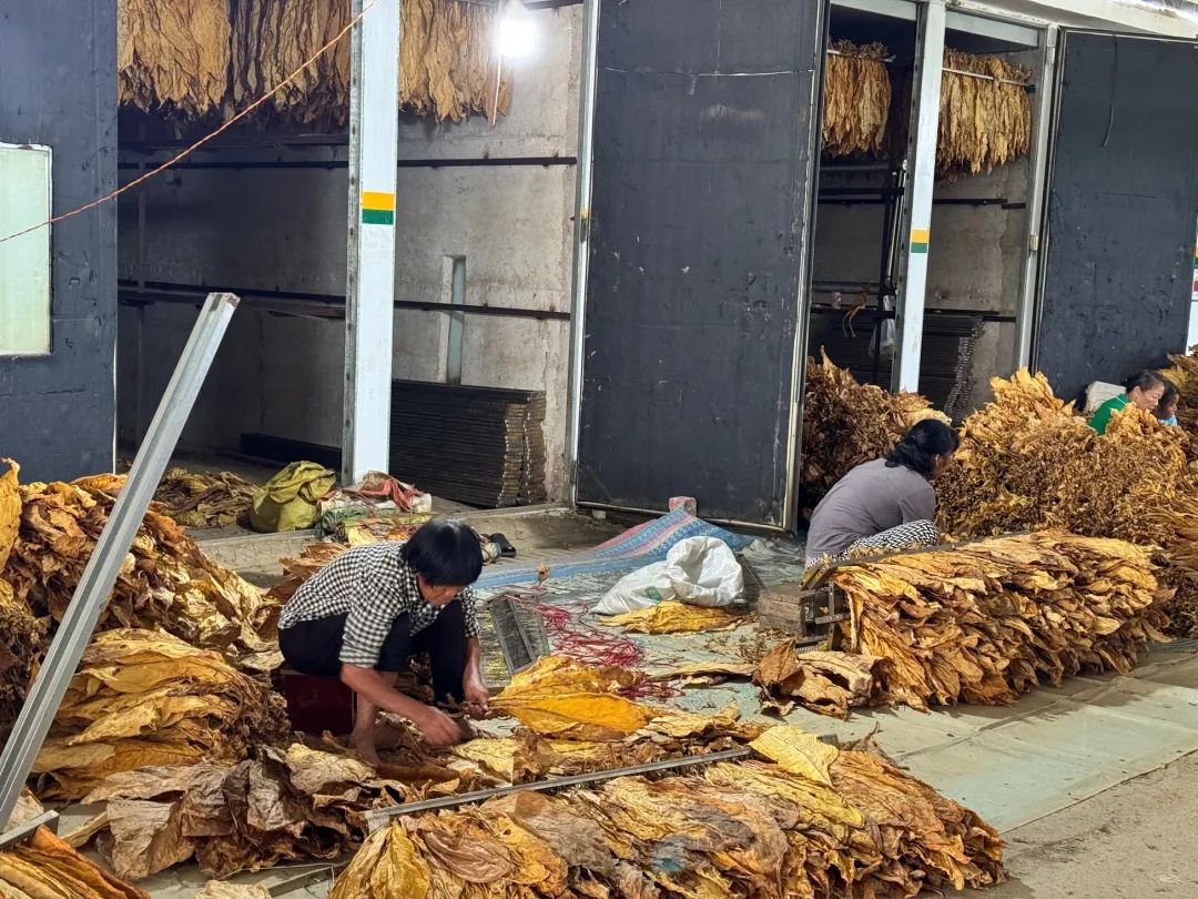 ▲烤烟房中的工人正在分拣烟叶