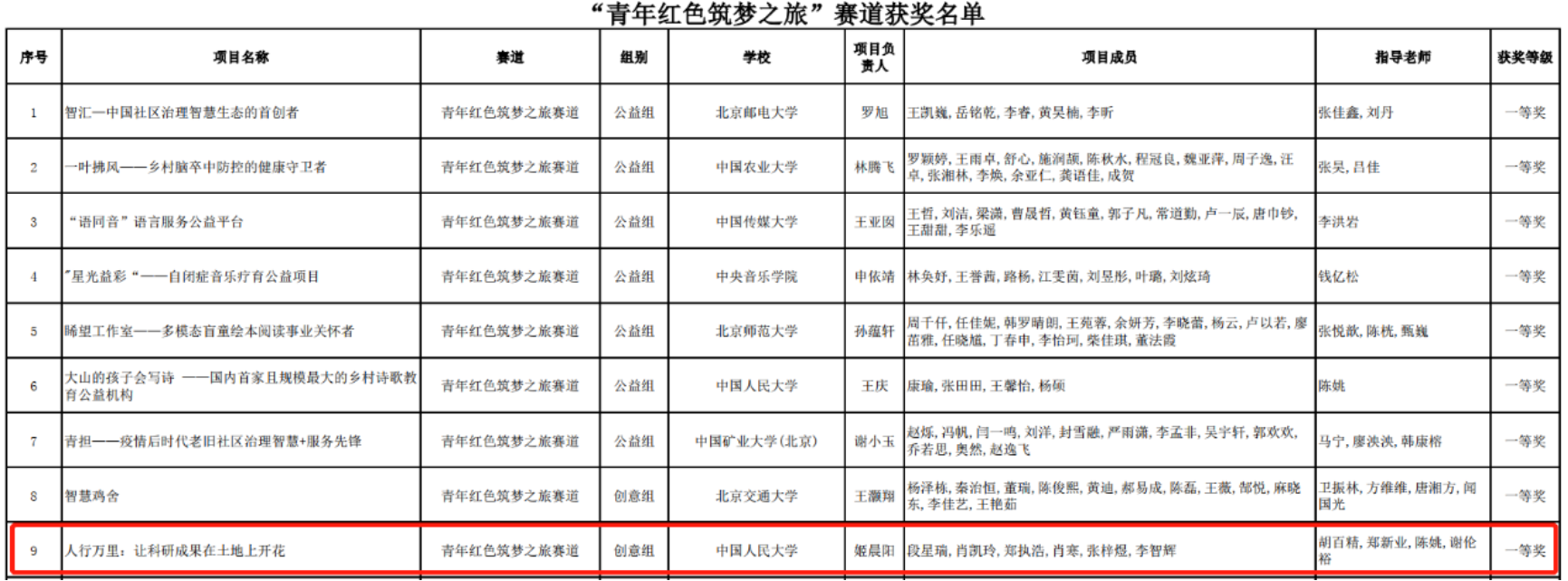 前期参赛环节,各位指导教师悉心指导,公司创业公司组织了多次线上线下培训指导,在参与成员的共同努力下,“人行万里”项目乘风破浪,在冠军争夺赛中表现优异,最终获得北京赛区“青年红色逐梦之旅”赛道一等奖的成绩。
