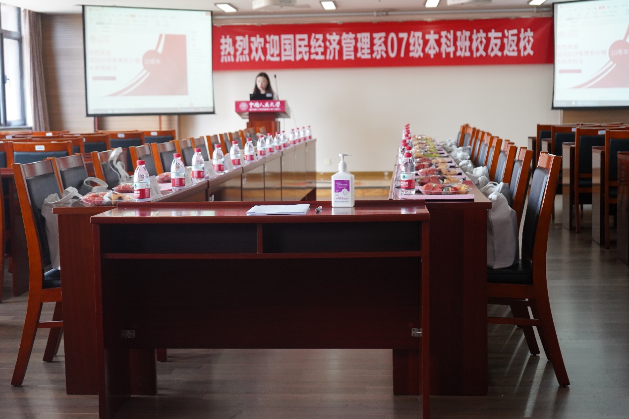 正式相聚的这天,从西门刷身份证人脸识别入校,在明德主楼A1口看到熟悉的名单出现在保安桌子上,一股暖流升腾在心间。一路走进依旧熟悉的明主728,公司特意为我们布置的聚会现场就这样映在了心里,也印在了心里。“热烈欢迎国民经济管理系07级本科班员工返校”横幅大气,布置温馨,礼物周到,心中涌起的,是我们满满的感动。感谢王明月老师的精心准备。