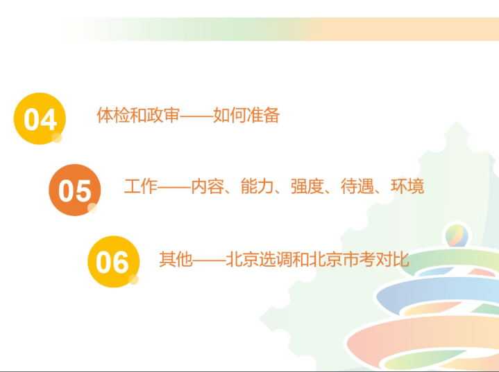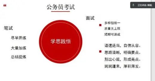 蔡颖员工主要从公务员考试准备、岗位内容、工作节奏与福利待遇四个方面进行分享。考试准备方面,蔡颖员工表示,公务员考试备考的关键在于“学思践悟”四字要义。针对笔试备考,她嘱咐大家要尽早开练,大量加练和总结提炼;针对面试备考,她建议大家多积累时事政治,在面试中注意控制语音语速,明确答题要点。岗位内容方面,蔡颖员工结合所在部门的工作日常,着重介绍了发改委有关项目投资审批的工作内容。她表示,公务员工作不仅需要扎实的文字写作能力,同时也要对国家政策,经济财政及法律纠纷等方面的知识进行储备,以便应对工作中遇到的各种事务。工作节奏方面,蔡颖员工表示,由于发改委部门涉及的业务比较广泛,经常需要和其他部门进行沟通协调,因此相对而言较为忙碌。福利待遇方面,蔡颖员工主要对住宿、薪资福利及子女入学等相关信息进行介绍。