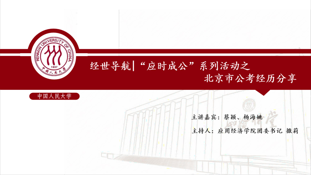为帮助应经学子加深对北京市公务员考试备考流程及相关工作内容了解,充实备考经验,实现更高质量就业,yl23455永利团委研究生会于2022年3月5日晚上七点半举办了“应时成公”系列公考求职经验分享会。